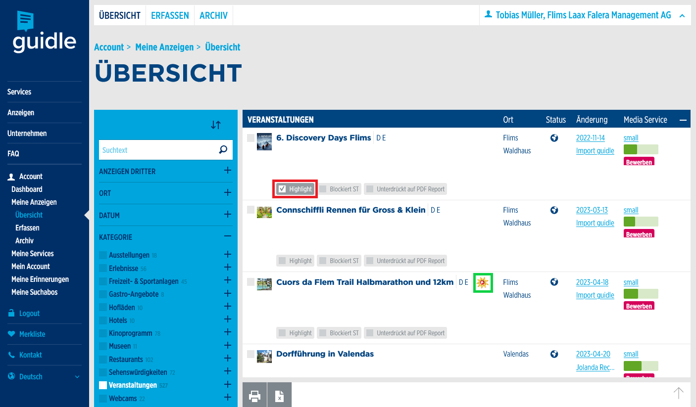Wählen Sie die Checkbox "Highlight" bei einer oder mehreren Veranstaltungen. Das Symbol zeigt, welche Veranstaltungen bereits in die Selektion der Top-Veranstaltungen von Schweiz Tourismus aufgenommen wurden.