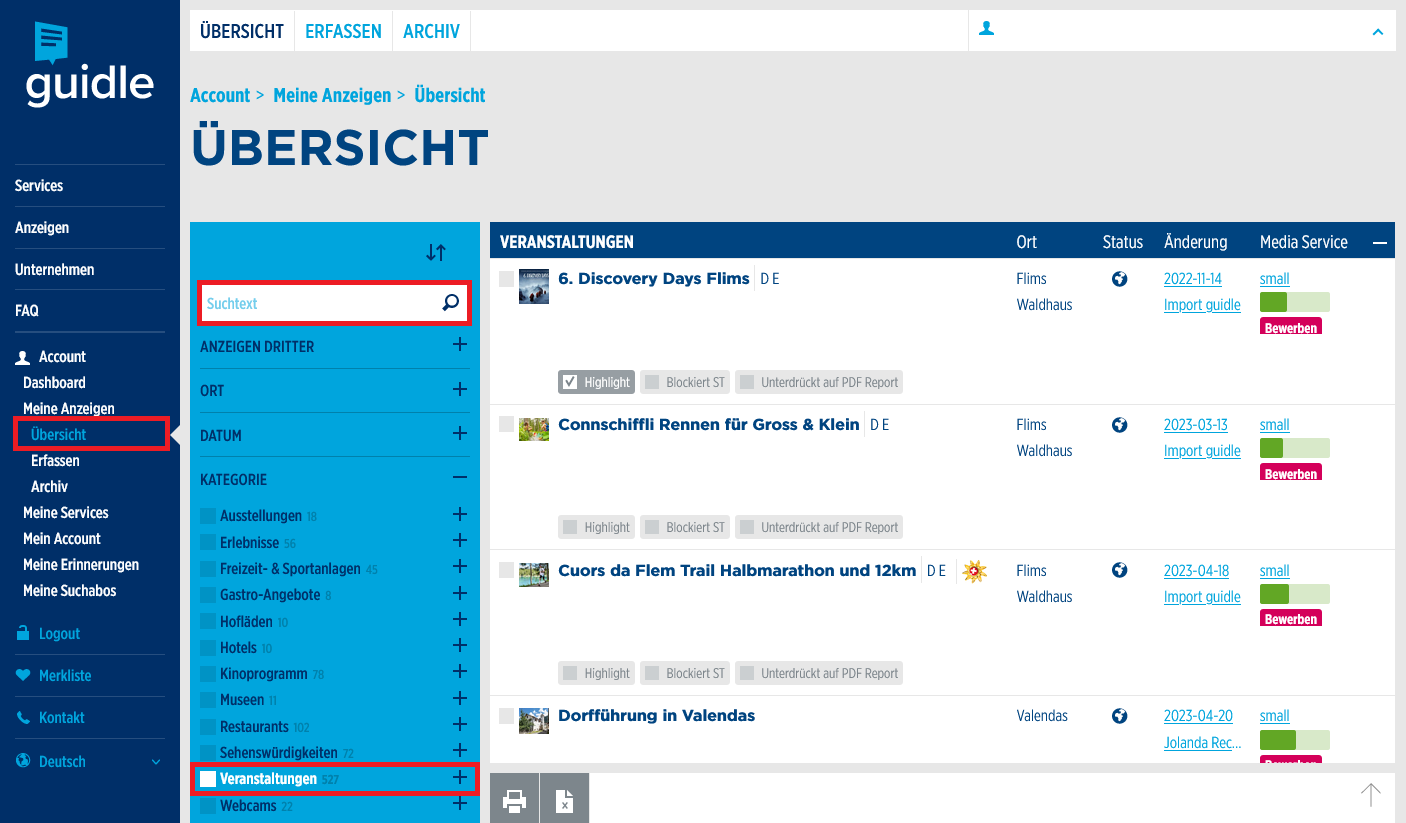 Klicken Sie links in der Navigation auf Meine Anzeigen / Übersicht und filtern Sie anschliessend nach der Rubrik Veranstaltungen. Sie sehen alle Veranstaltungen aus Ihrer Region. Nutzen Sie die Suchtext- und Filterfunktionen, um die angezeigten Veranstaltungen einzugrenzen.