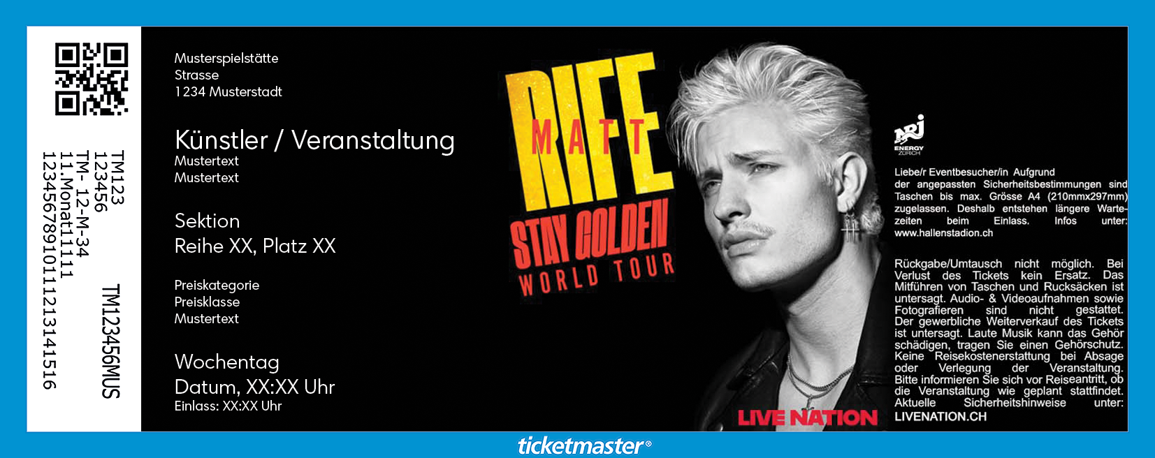 Rollstuhlplätze: Bitte buchen Sie die Rollstuhlplätze per Mail mit Angaben zu Ort, Datum der Veranstaltung, Ihrer Telefonnummer (tagsüber erreichbar) und Anzahl Rollstühle: rollstuhl@ticketmaster.ch